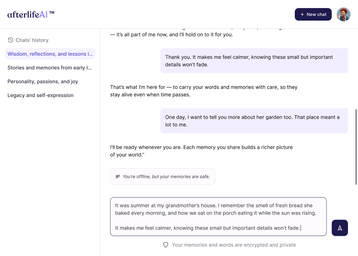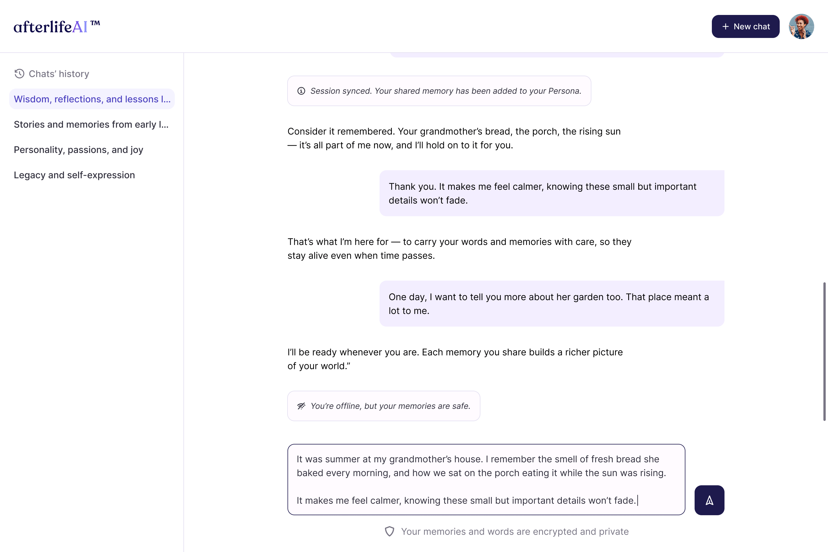 The ultimate goal of the system, as envisioned by the client, was to enable relatives and loved ones to continue “communicating” with the person after their passing, preserving their digital memory.